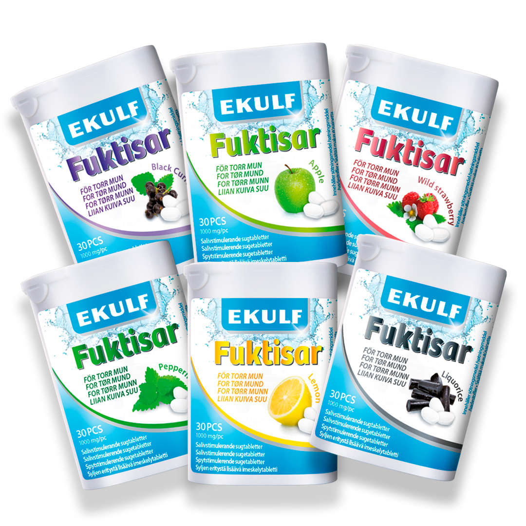EKULF Fuktisar er sukkerfrie sugetabletter som stimulerer salivproduksjon på en effektiv måte. De aktive stoffene er eplesyre, natriumsitrat, disalsiumfosfat og xylitol som bevarer den funksjonelle fuktigheten i munnen. Sammen hjelper de og ingrediensene med å balansere pH-verdien i munnen. Til søtningsmiddel brukes xylitol, sorbitol, isomalt og steviaglykosider hvor xylitol er hovedsaklig søtningsmiddel. Tablettene gir en frisk og behagelig følelse og brukes etter hvert måltid eller ved behov. Sugetablettene leveres i en liten eske som er smidig å ta med seg overalt. Produktet er produsert i Sverige i følge GMP-regler. En eske inneholder 30 tabletter.