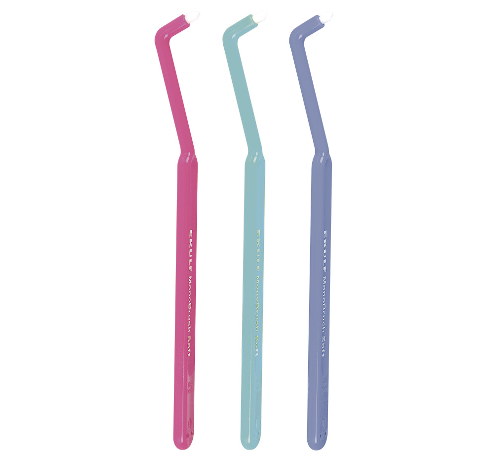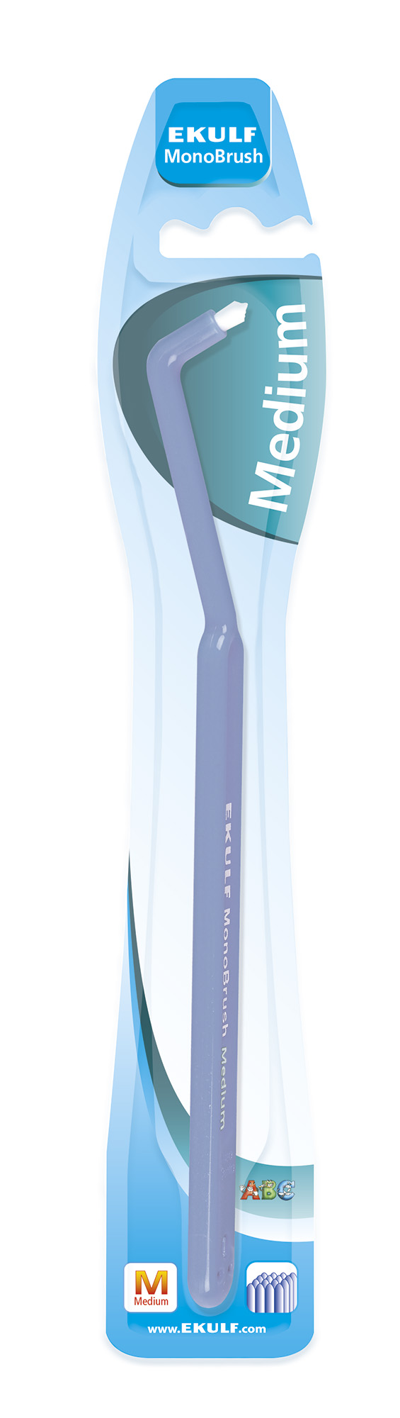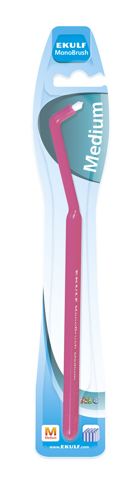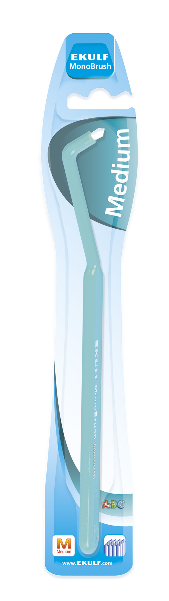 EKULF MonoBrush er en vinklet tannbørste med et lite, kompakt børstehode og myke, topprundede børstestrå som gir skånsom, men effektiv rengjøring. Den er spesielt utviklet for å forbedre munnhygienen hos personer med spesielle behov og egner seg utmerket til rengjøring rundt tannregulering, visdomstenner, implantater, broer og protese. Den vinklete halsen gjør det enkelt å komme til langs tannkjøttkanten, mellom tennene og på visdomstenner. MonoBrush er et utmerket supplement til daglig tannpuss.