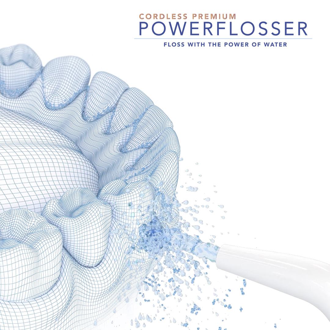 Med en kraftig, ultrafin vannstråle (0,65 mm) kombinert med pulserende teknologi, hjelper PowerFlosser Premium deg med effektivt å fjerne plakk, stimulere blodsirkulasjonen og motvirke betennelser i tannkjøttet. Perfekt også for deg med regulering, broer, implantater eller sensitivt tannkjøtt.